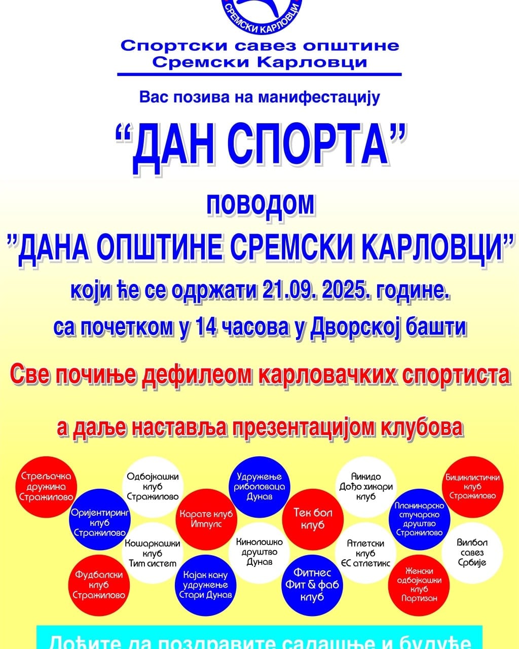 Смотра спортских клубова и њихових капацитета, под називом „Дан спорта“, биће одржана у Сремским Карловцима у недељу, 21. септембра од 14 часова у Дворској башти.