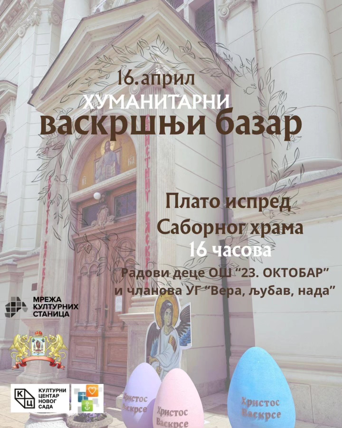 Посетиоци ће имати прилику да купе васкршња јаја и креативне радове ученика Основне школе „23. октобар“ и чланова удружења грађана „Вера, љубав, нада“.