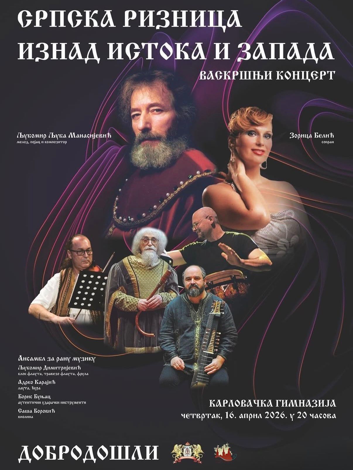 СРЕМСКИ КАРЛОВЦИ – У сусрет највећем хришћанском празнику, Свечана сала чувене Карловачке гимназије биће домаћин јединственог музичког догађаја. У четвртак, 16. априла 2026. године, са почетком у 20 часова, одржаће се свечани Васкршњи концерт под називом „Српска ризница – изнад Истока и Запада“.